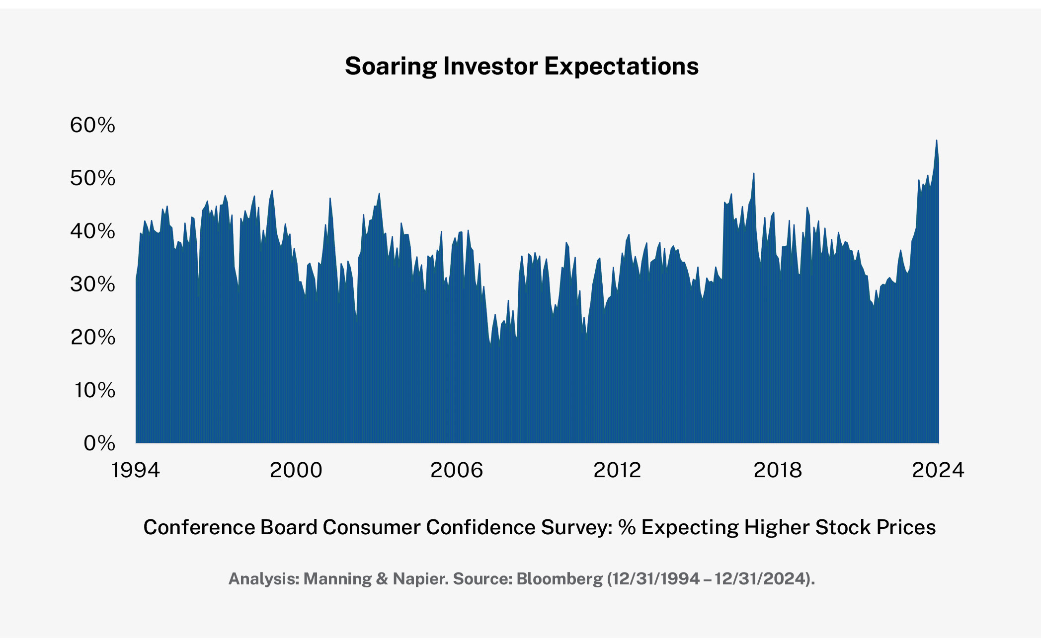 The S&P 500 begins 2025 at valuation levels that historically have proven challenging for long-term returns. Both the absolute and cyclically adjusted price-to-earnings ratio on the index are at levels that suggest long-term forward returns will be muted. Measures of investor sentiment from both pros and amateurs alike sit somewhere between very enthusiastic and downright exuberant. The major US indexes seem priced for perfection.