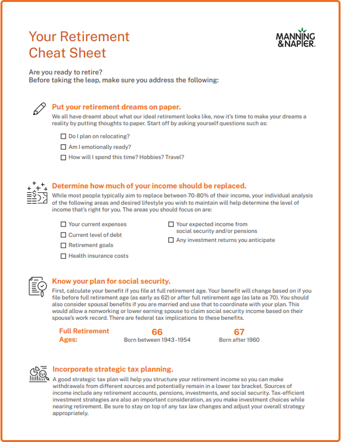 No matter what your retirement timeline is, planning early can help ease the transition. Our Retirement Cheat Sheet is full of helpful tips and to-dos to help you get started and ensure you’re on track to live the retirement you've been dreaming of.