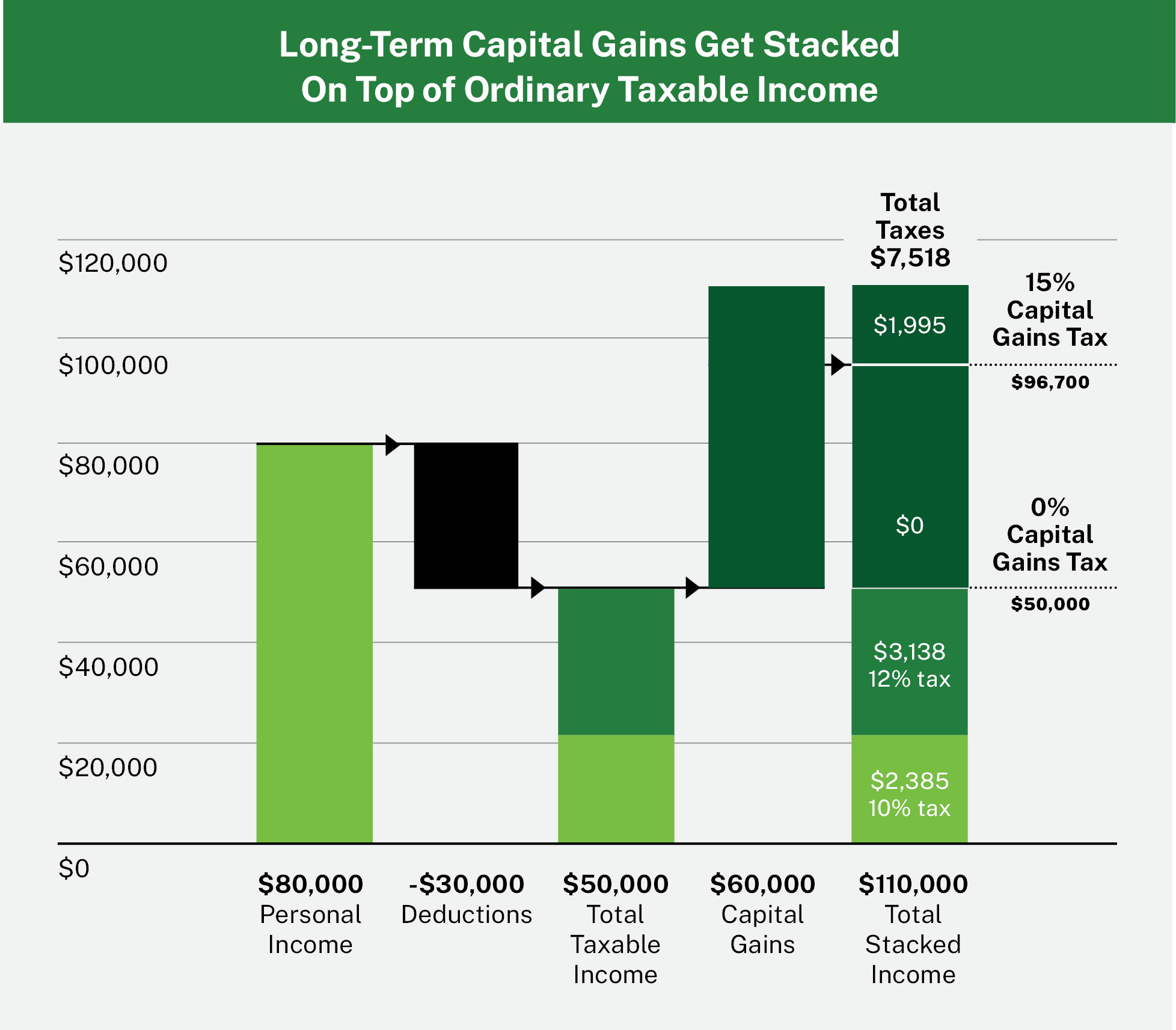The calculation of capital gains taxes is often an area of confusion, even for sophisticated investors. Income from all sources including wages, interest, retirement plan distributions, dividends, and capital gains, are all added together to reach gross income, and then are taxed at different rates. Investors often wonder whether selling an asset at a large gain will push them into a higher income tax bracket.