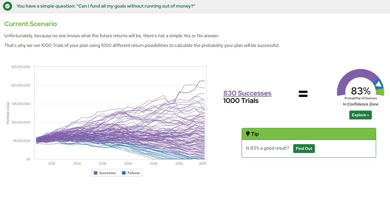 Monte Carlo, on the other hand, is related to the Bad Timing analysis, but looks at both the upside and downside. By running 1,000 simulations of possible outcomes, based on return forecasts, risk expectations (i.e., standard deviations), and correlations, your portfolio is run up against an extremely wide range of different outcomes. At the end of the trials, you will receive a probability of success that can help identify what changes can be made to improve the portfolio for the unexpected.
