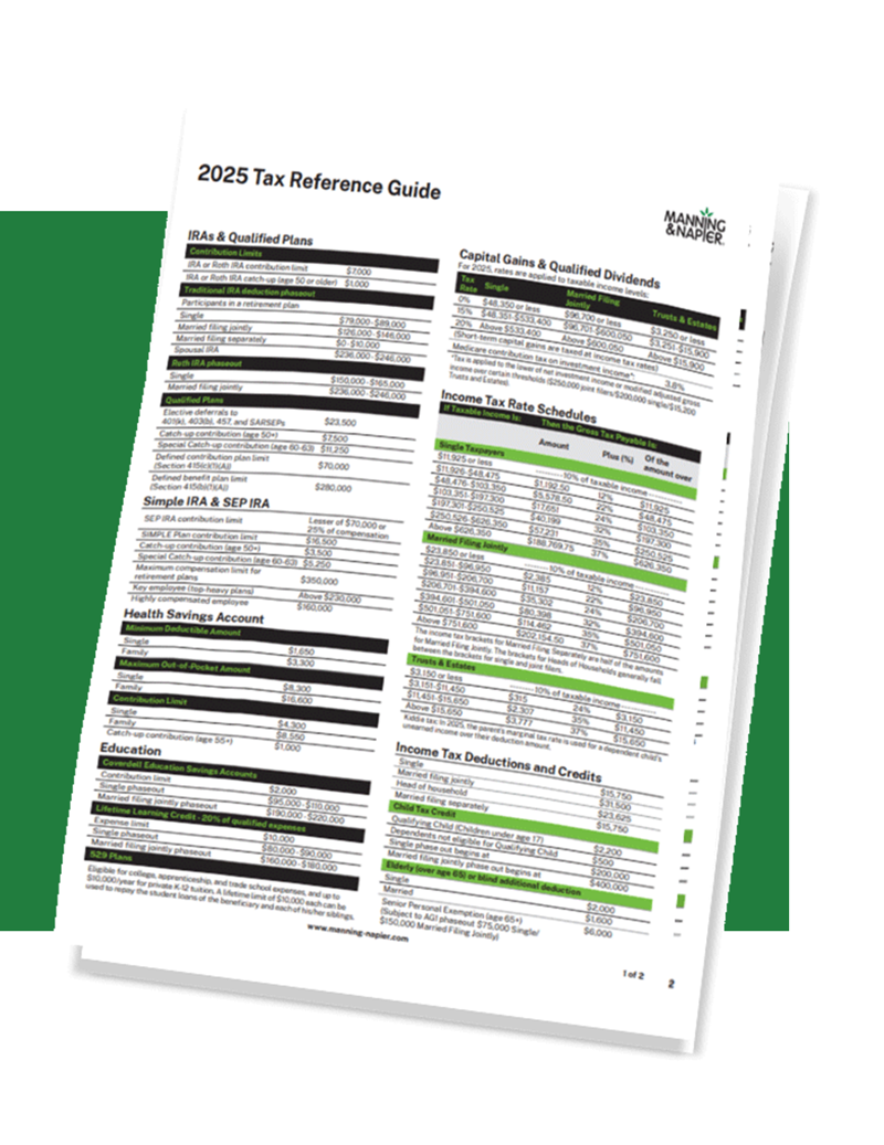 At this point, nothing is formal or guaranteed, yet the goal of planning is to be prepared – for both the expected and unexpected. Here at Manning & Napier, a key aspect of our role is to advise individuals on proposed or enacted tax policies by identifying key provisions that can impact investments and planning considerations. We work closely with individuals to build this information into our planning services to help clients understand and navigate the landscape to stay on track and focused on achieving their goals, and we’re here to help you, too.